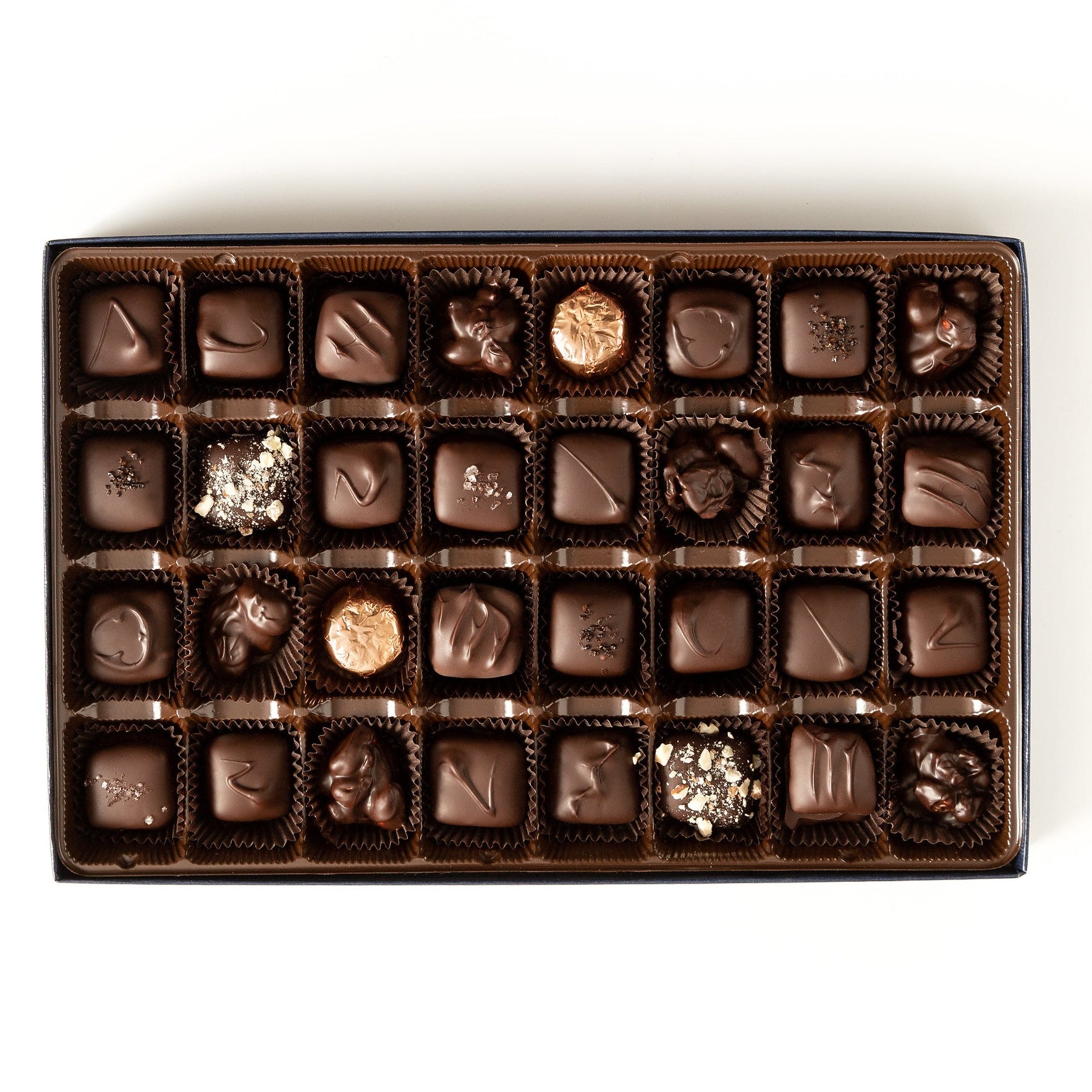 A variety of caramels, nuts, nougats, toffee, crackle and more, dipped in dark chocolate.