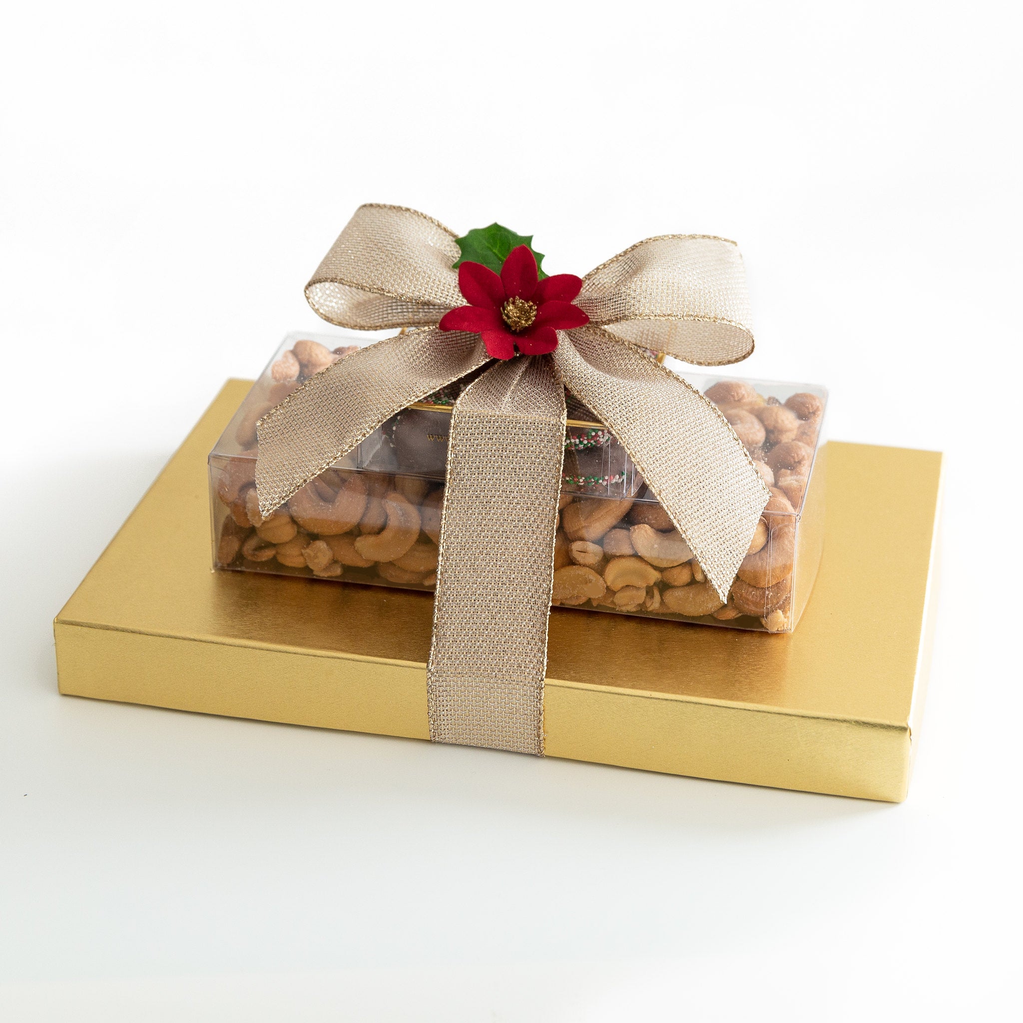 Colorful tiny beads of sugar decorate our signature Milk Chocolate Non Pareils which are included in this tower with our Homemade Chocolates and Fresh Roasted Cashews. Contents include 14 oz. Popular Assortment of Chocolates, 1lb. Cashews, and .31 lb Milk Chocolate Christmas Non Pareils.