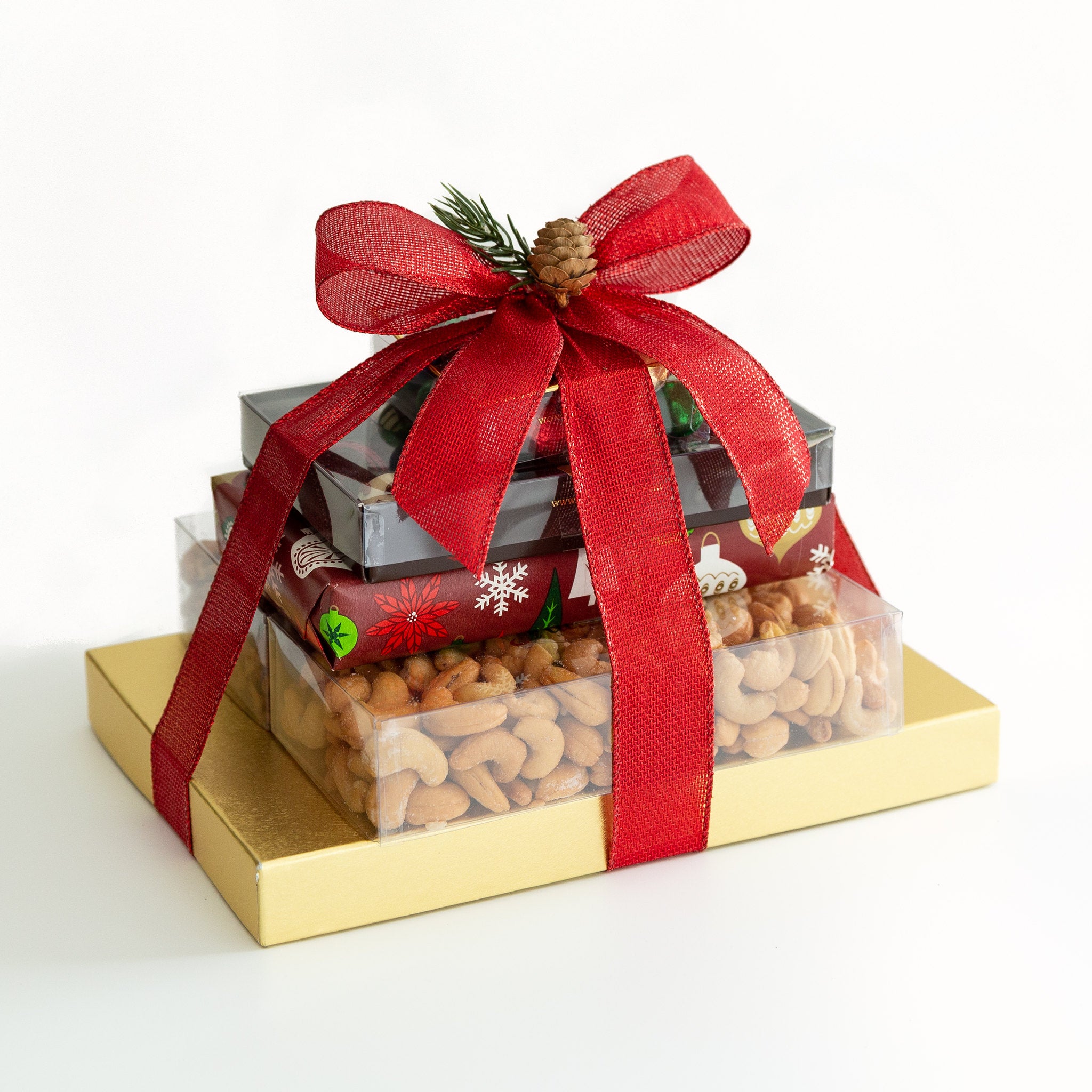 This beautifully presented generous 6 box tower is enough to share with many! We combine a delightful assortment of our all time most popular items and tie them together with festive ribbon and attractive embellishment.