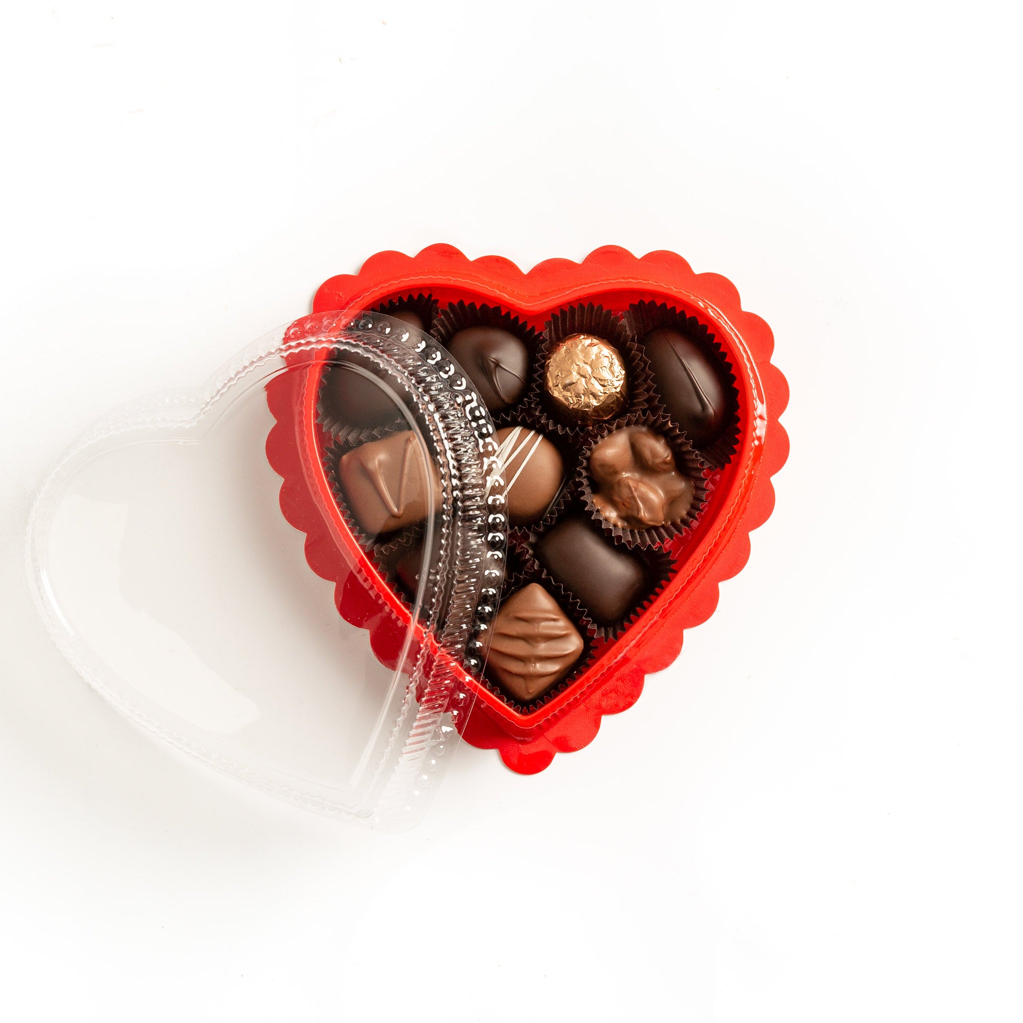 A red heart shaped box filled with of our most popular Milk and Dark chocolates, including creams, caramels, nuts, and more!