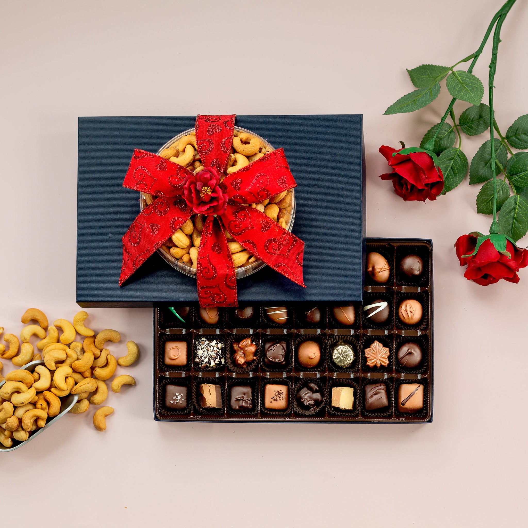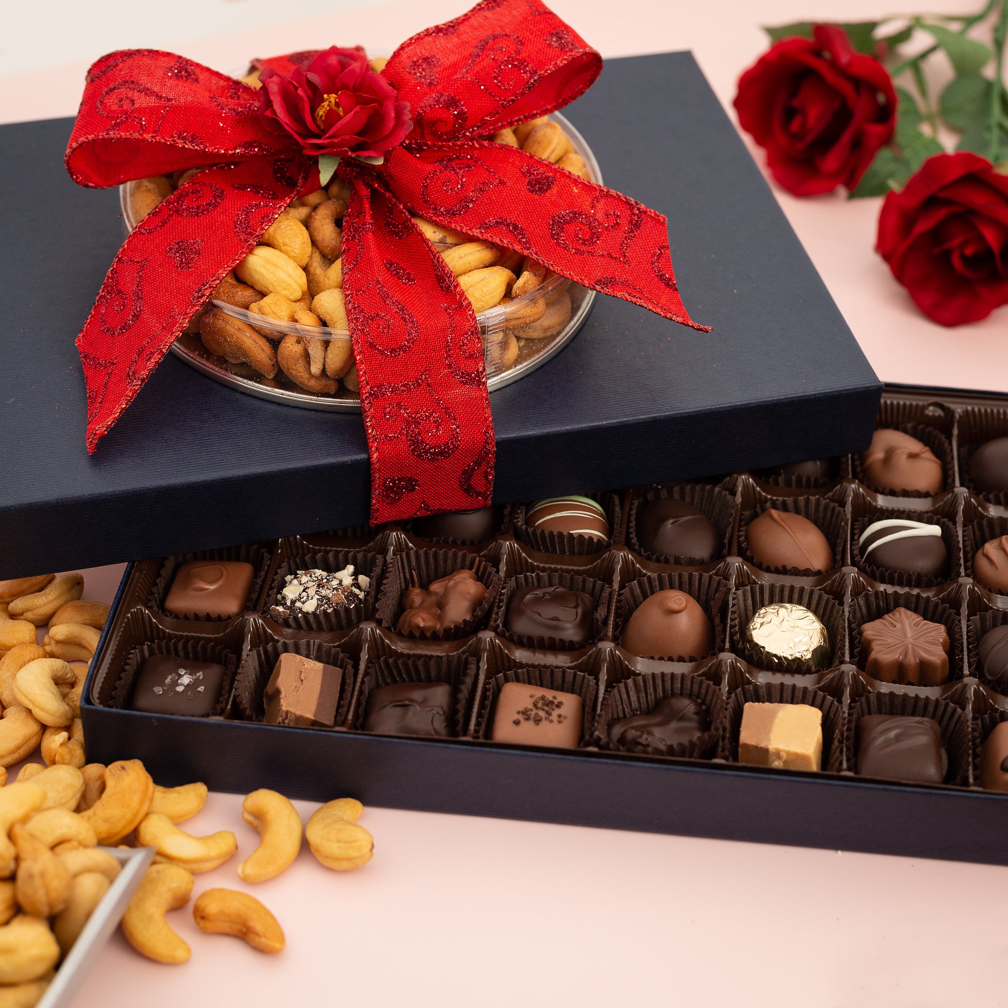 Our popular assortment of chocolates is crowned with a red heart shaped box with a clear cover to see the delicious extra large cashews inside. These are beautifully tied together with a red stain bow for Valentines Day!